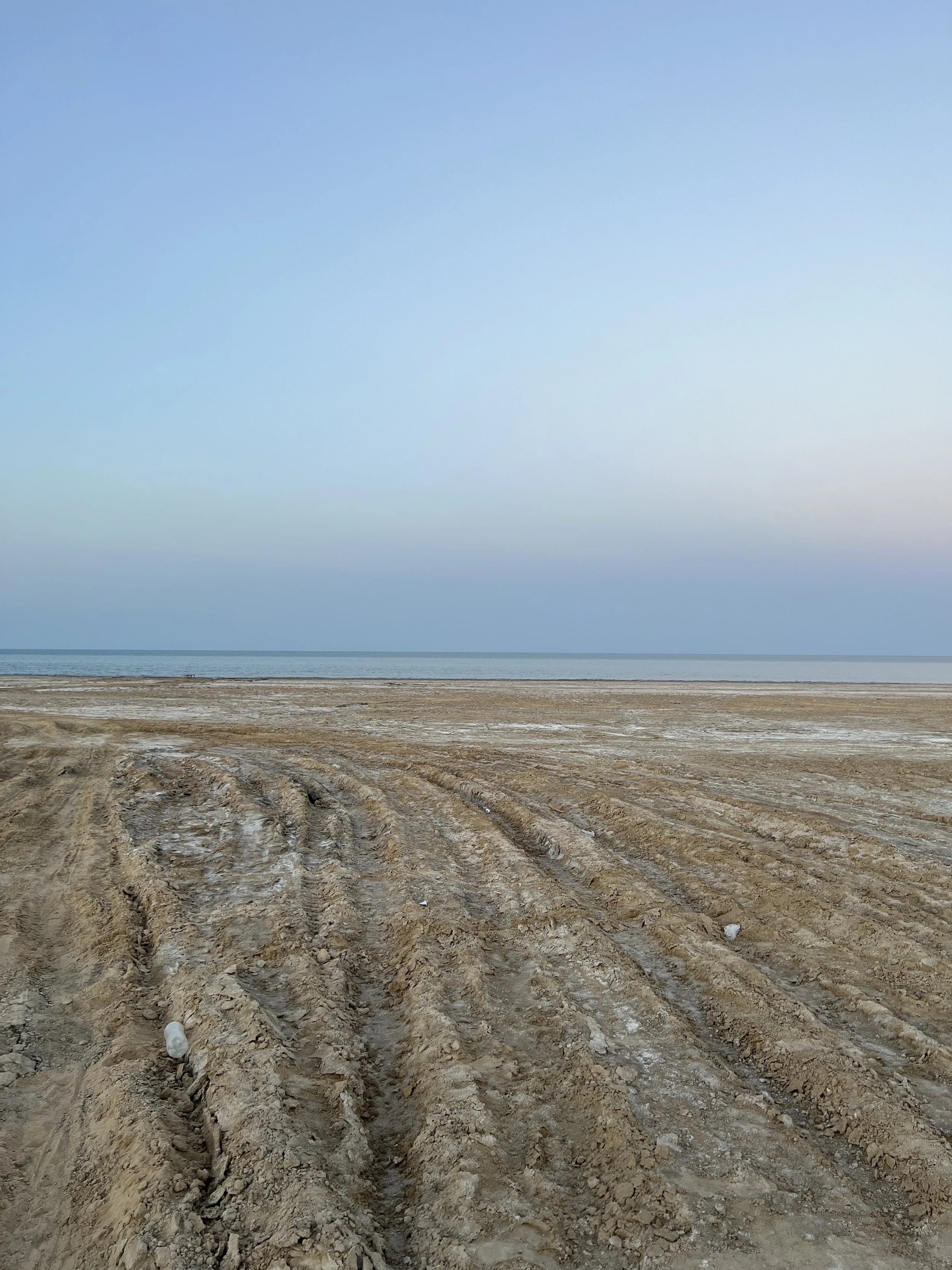 A sandy Aral Desert with tire tracks, the Aral Sea in the background, and a clear sky above. Photo by Dinara Mirtalipova for The Vanishing Sea Book research trip to the Aral Sea