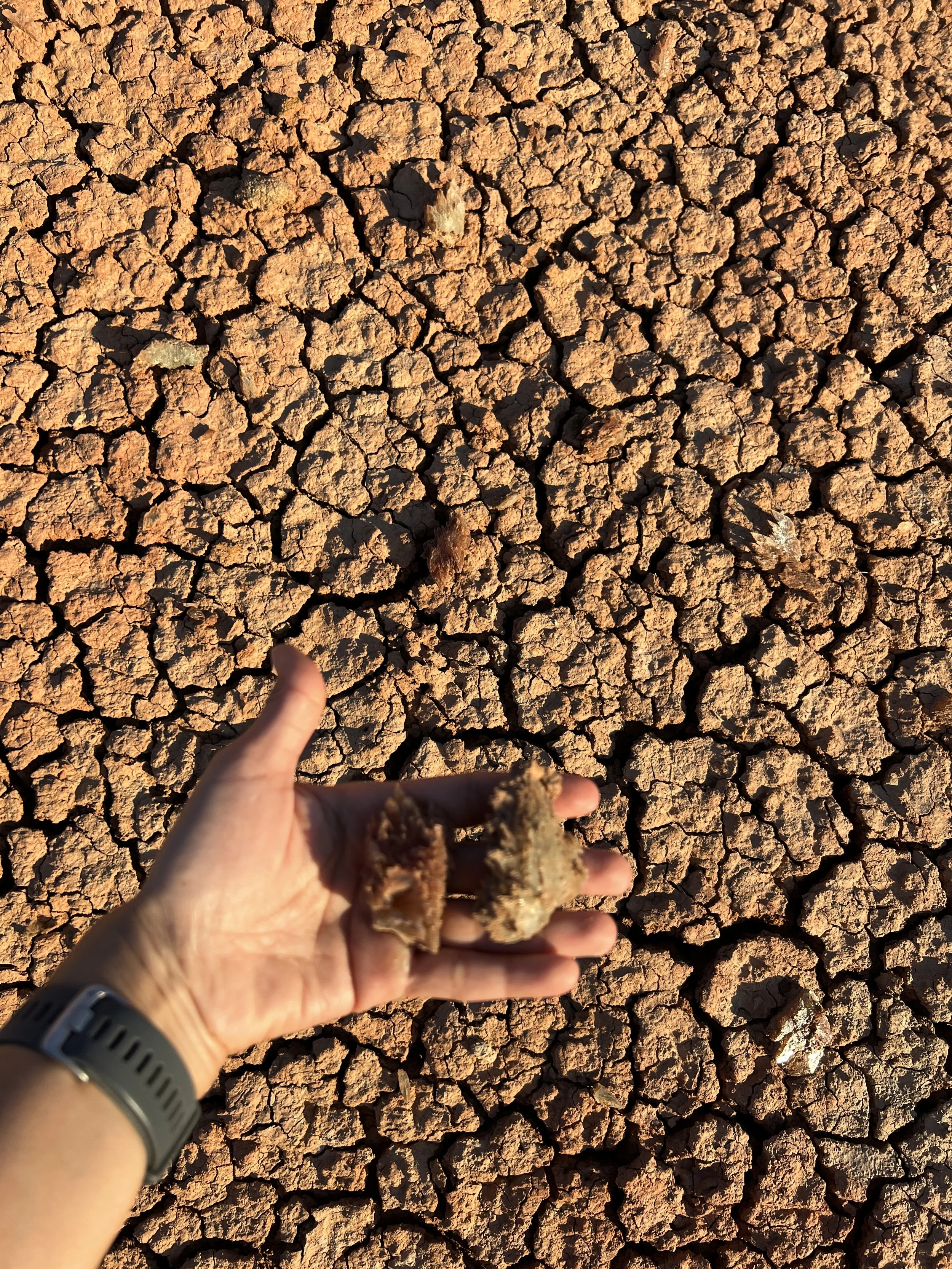 Dinara Mirtalipova's hand holding two pieces of Aral Desert dried, over cracked, dry earth. Photo by Dinara Mirtalipova for The Vanishing Sea Book research trip to the Aral Sea