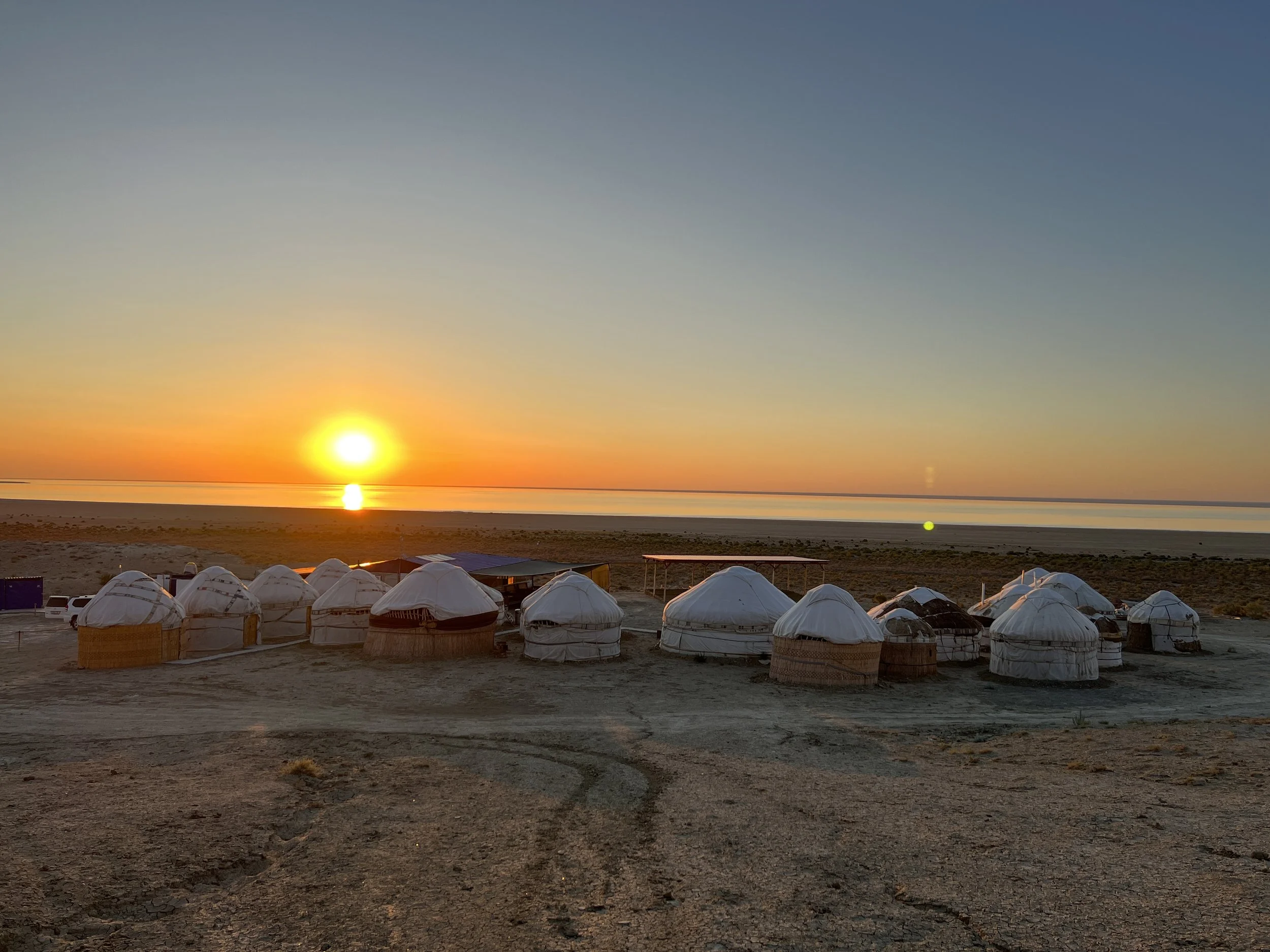 A group of yurts set up on a flat, dry Aral Deser terrain at sunset, with a calm body of water and a colorful sky in the background. Photo by Dinara Mirtalipova for The Vanishing Sea Book research trip to the Aral Sea