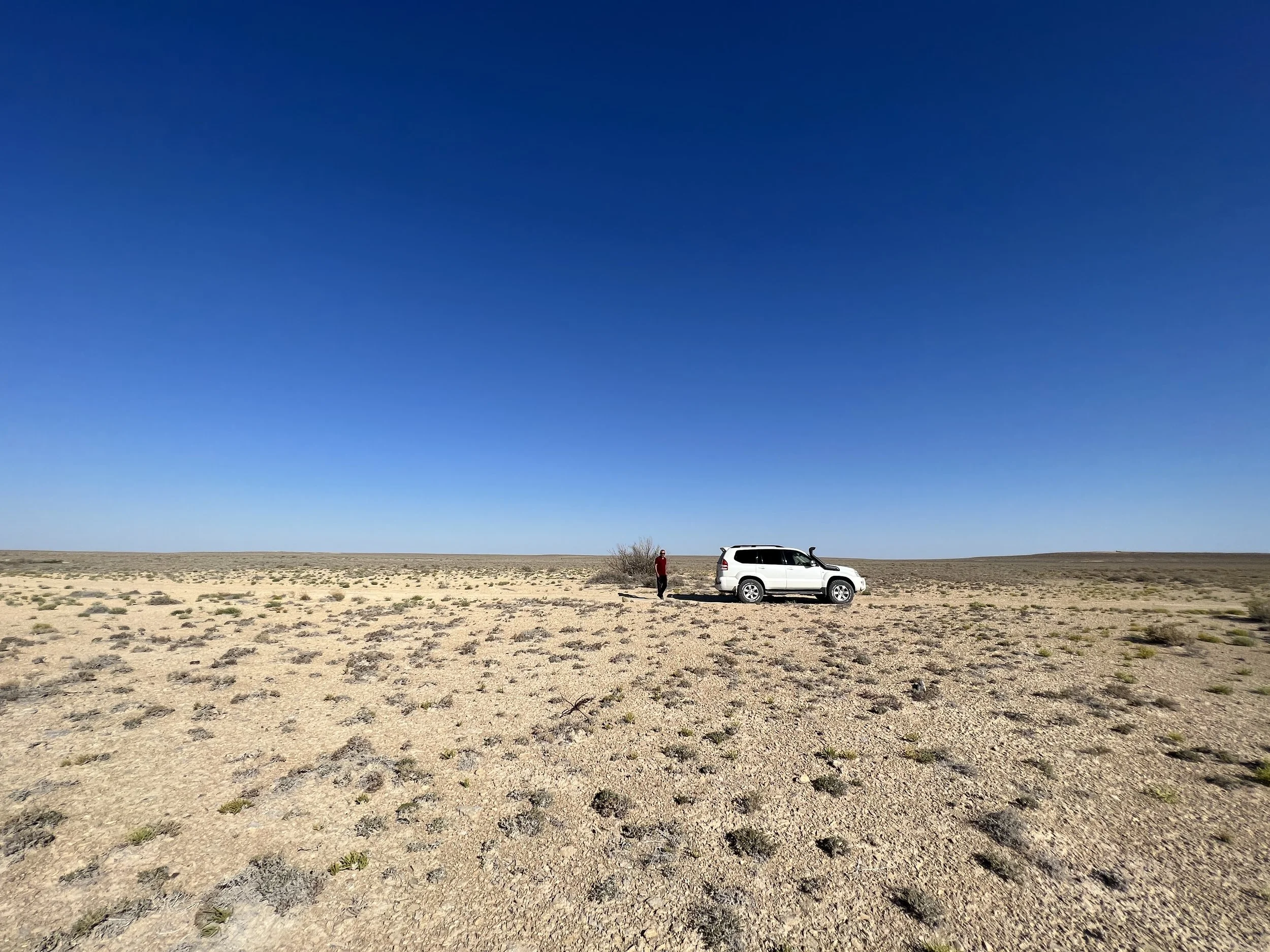 A person standing near a white SUV in a vast, arid Aral desert landscape under a clear blue sky Photo by Dinara Mirtalipova for The Vanishing Sea Book research trip to the Aral Sea