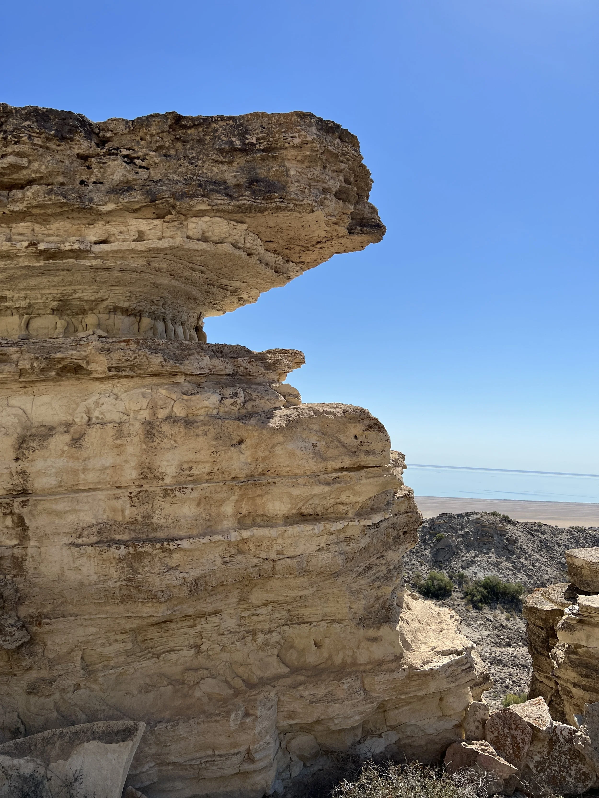 Close-up of layered sedimentary Aral Sea rock formation under a clear blue sky. Photo by Dinara Mirtalipova for The Vanishing Sea Book research trip to the Aral Sea