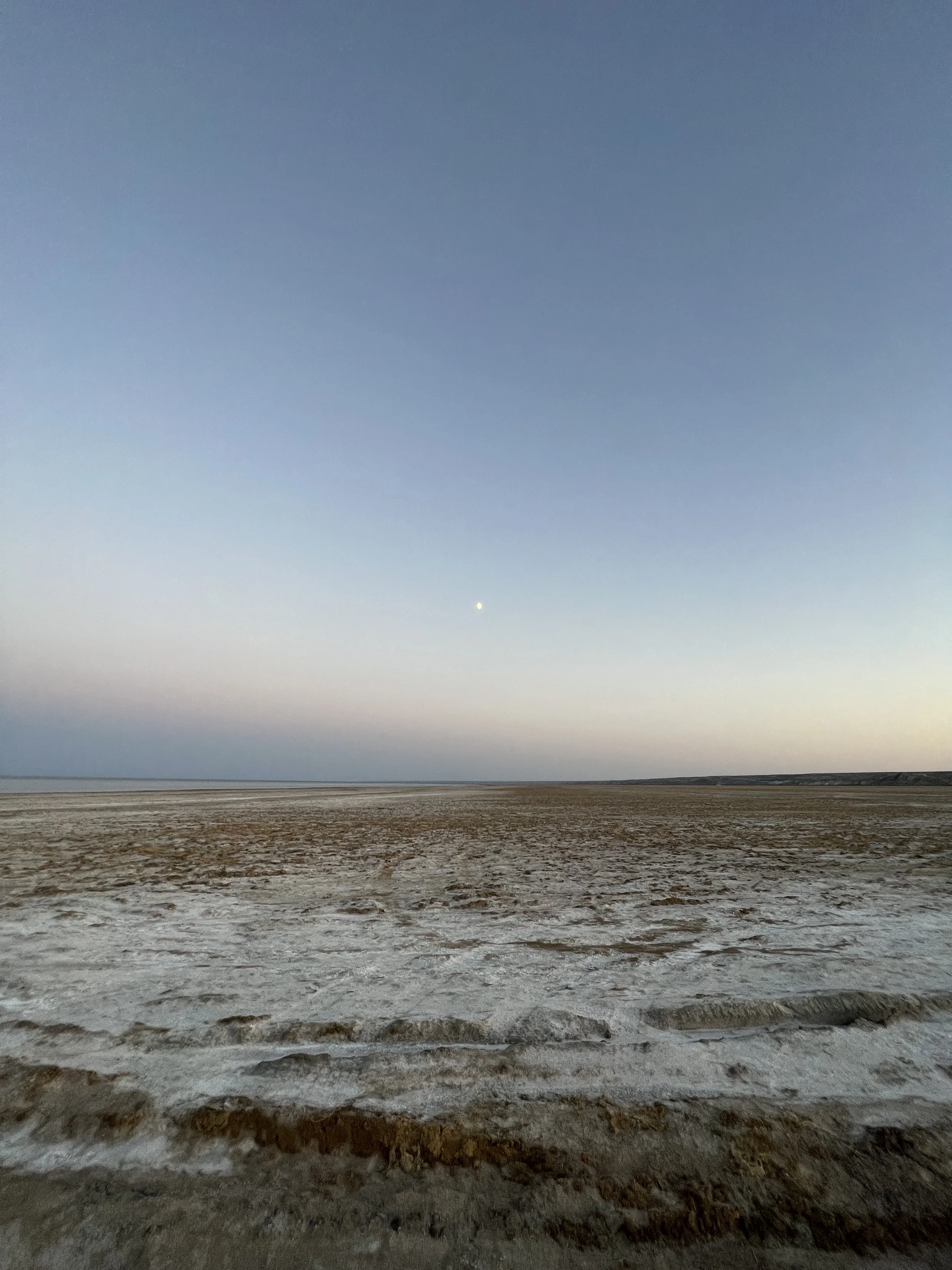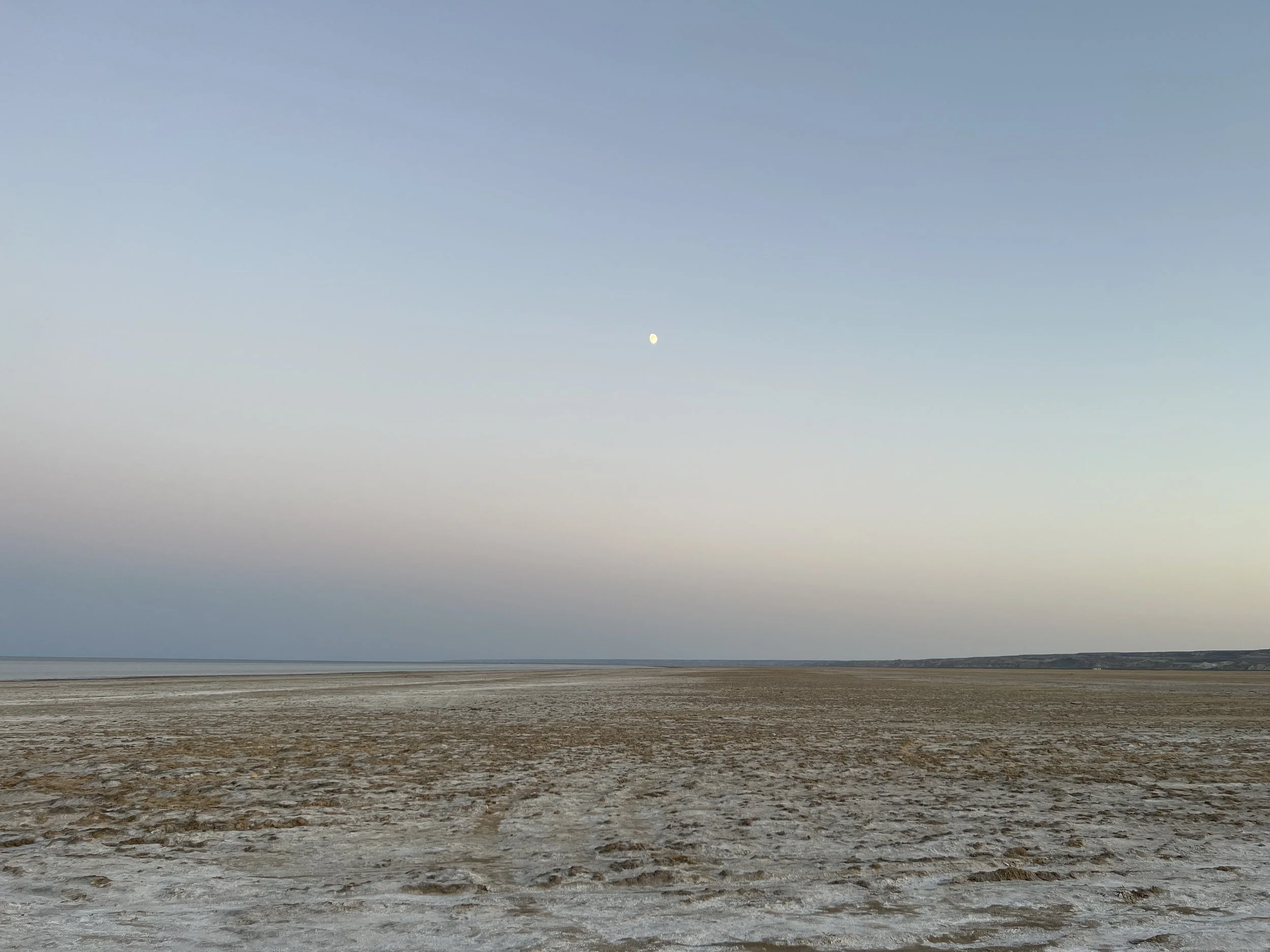 A vast, flat, salt-covered Aral desert landscape under a clear sky with a small moon visible at dusk or dawn. Photo by Dinara Mirtalipova for The Vanishing Sea Book research trip to the Aral Sea
