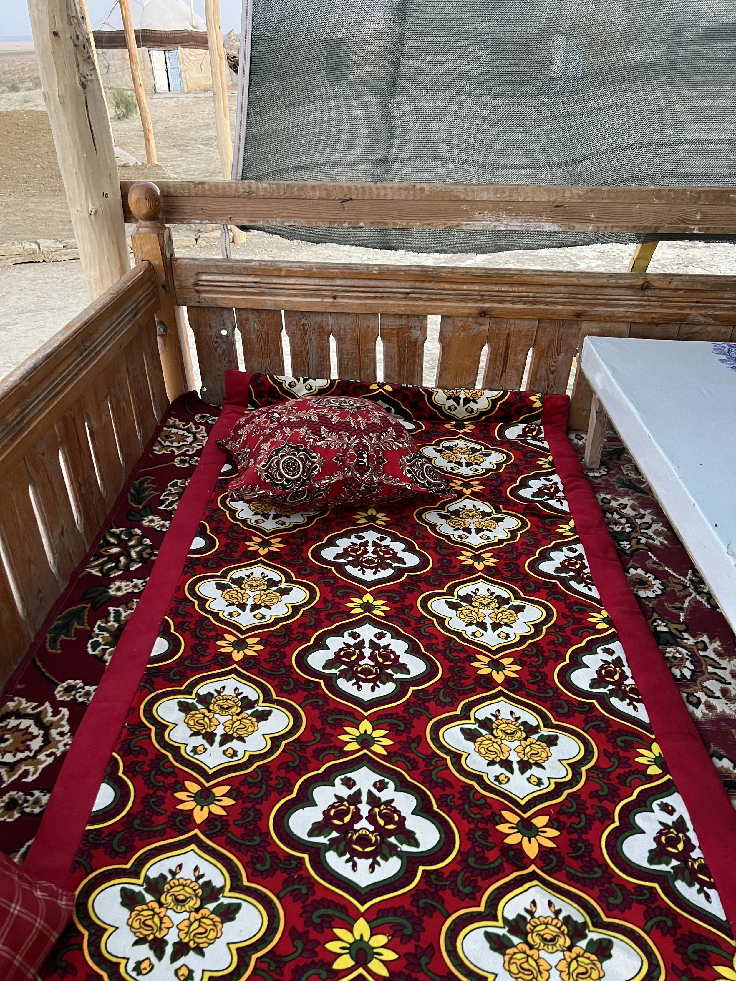 A qaraqalpaq wooden outdoor bed with a vibrant red, yellow, white, and green patterned blanket and a matching pillow, situated under a shaded structure. Photo by Dinara Mirtalipova for The Vanishing Sea Book research trip to the Aral Sea