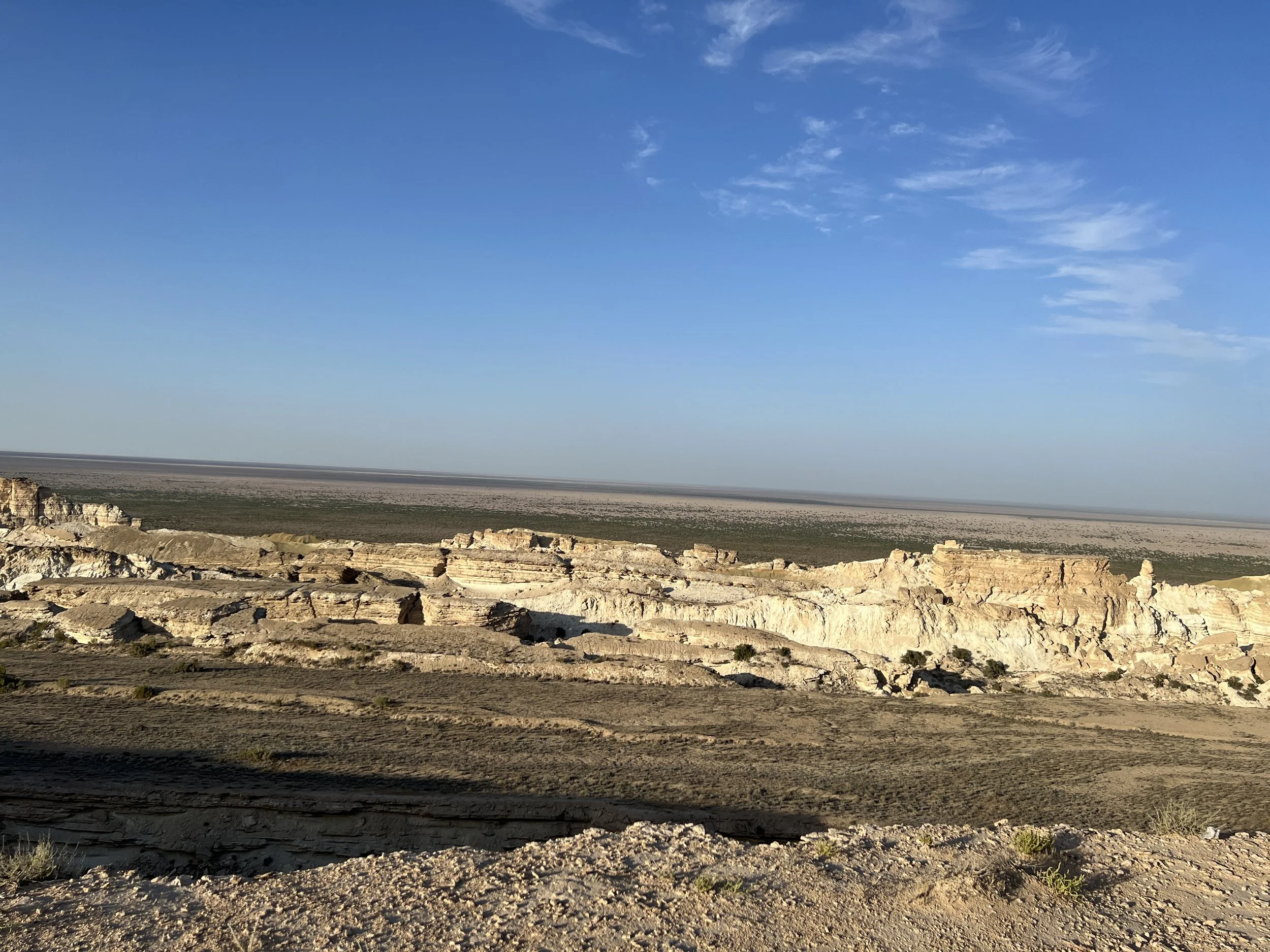 A wide view of The Aral desert landscape with layered, light-colored rock formations under a clear blue sky with a few wispy clouds. Photo by Dinara Mirtalipova for The Vanishing Sea Book research trip to the Aral Sea