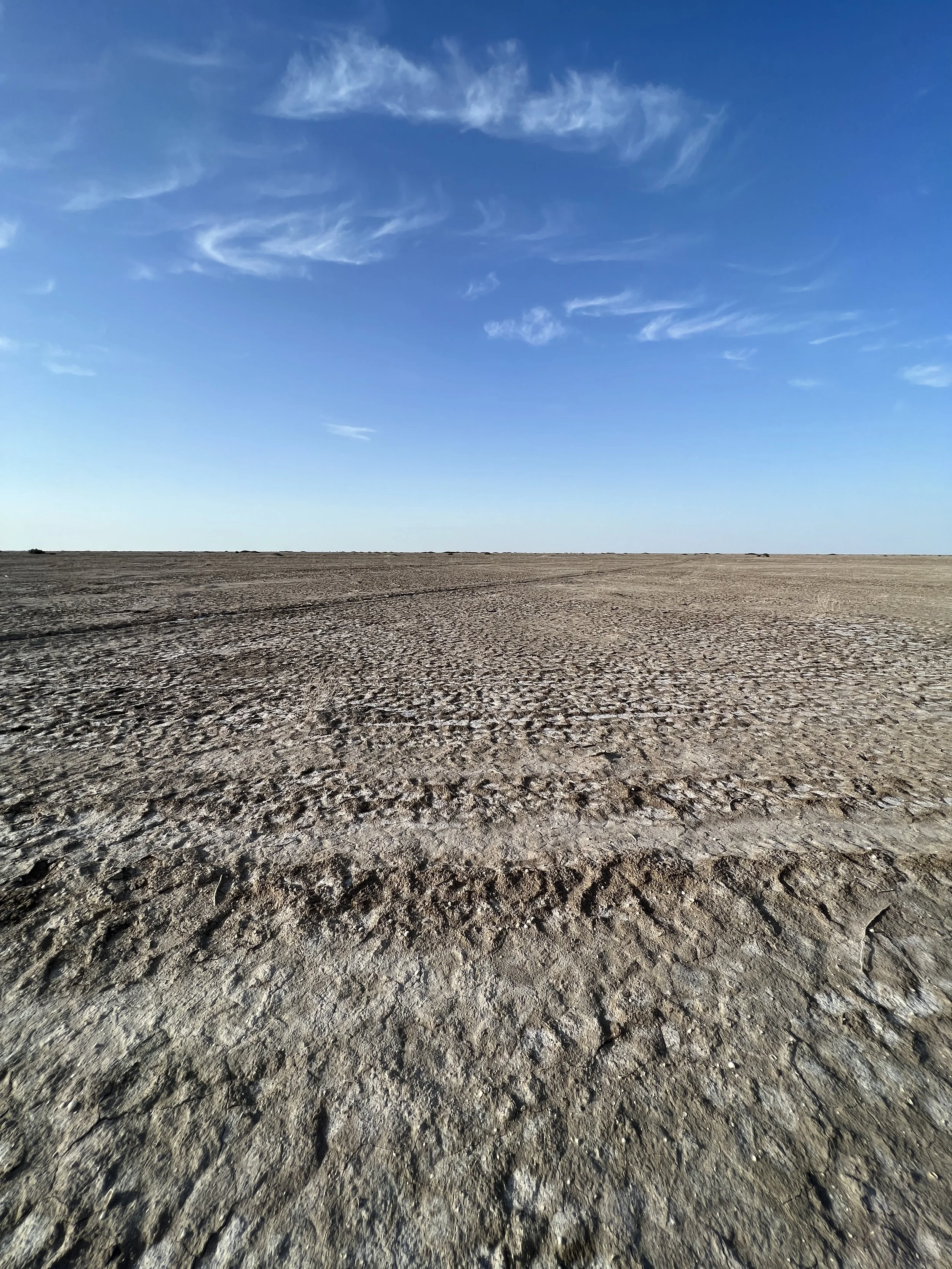 A flat, dry salt flat Aral Desert landscape under a bright blue sky with wispy white clouds. Photo by Dinara Mirtalipova for The Vanishing Sea Book research trip to the Aral Sea