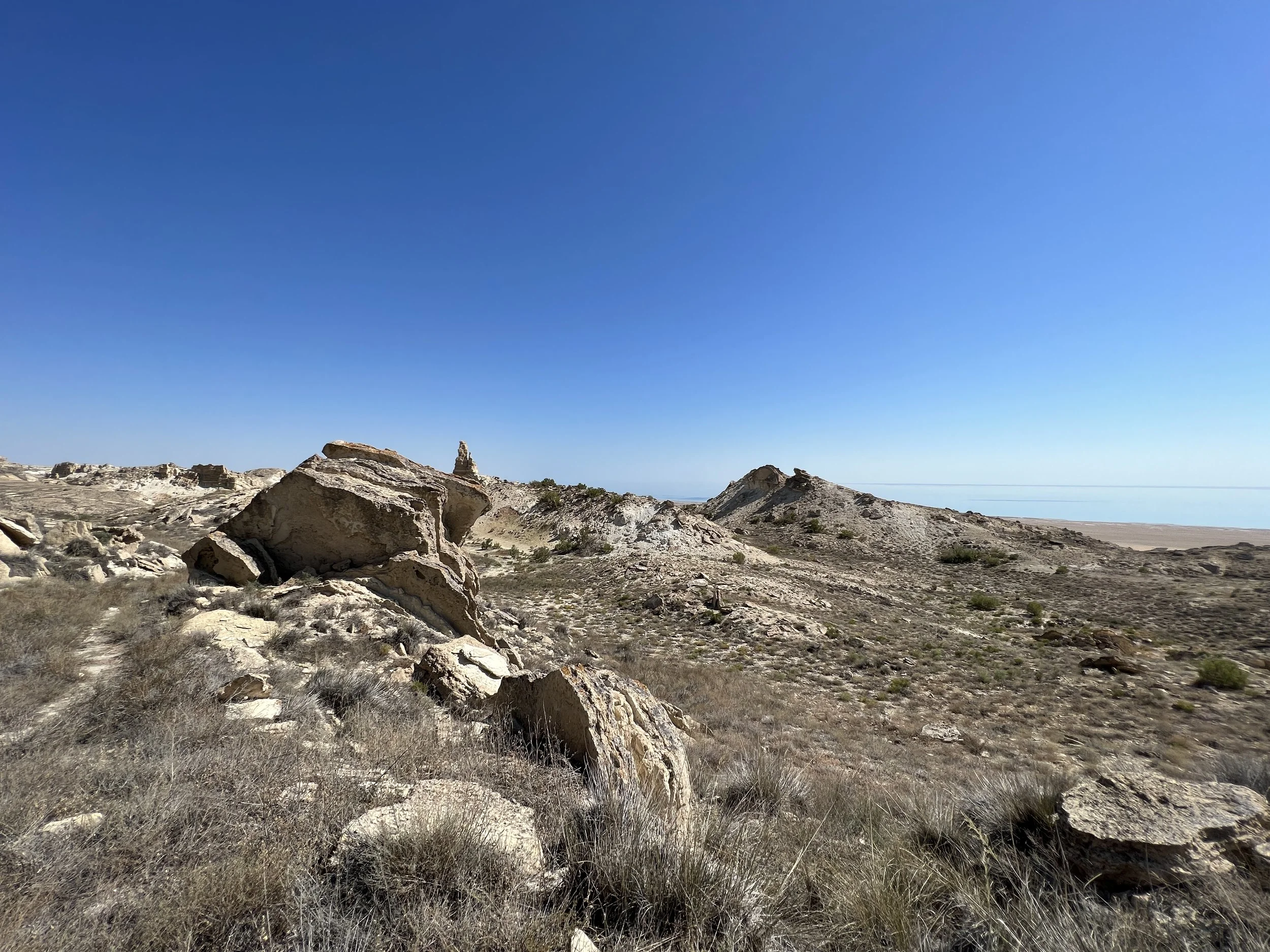 The Aral Desert landscape with large rocks, sparse vegetation, and a clear blue sky. Photo by Dinara Mirtalipova for The Vanishing Sea Book research trip to the Aral Sea
