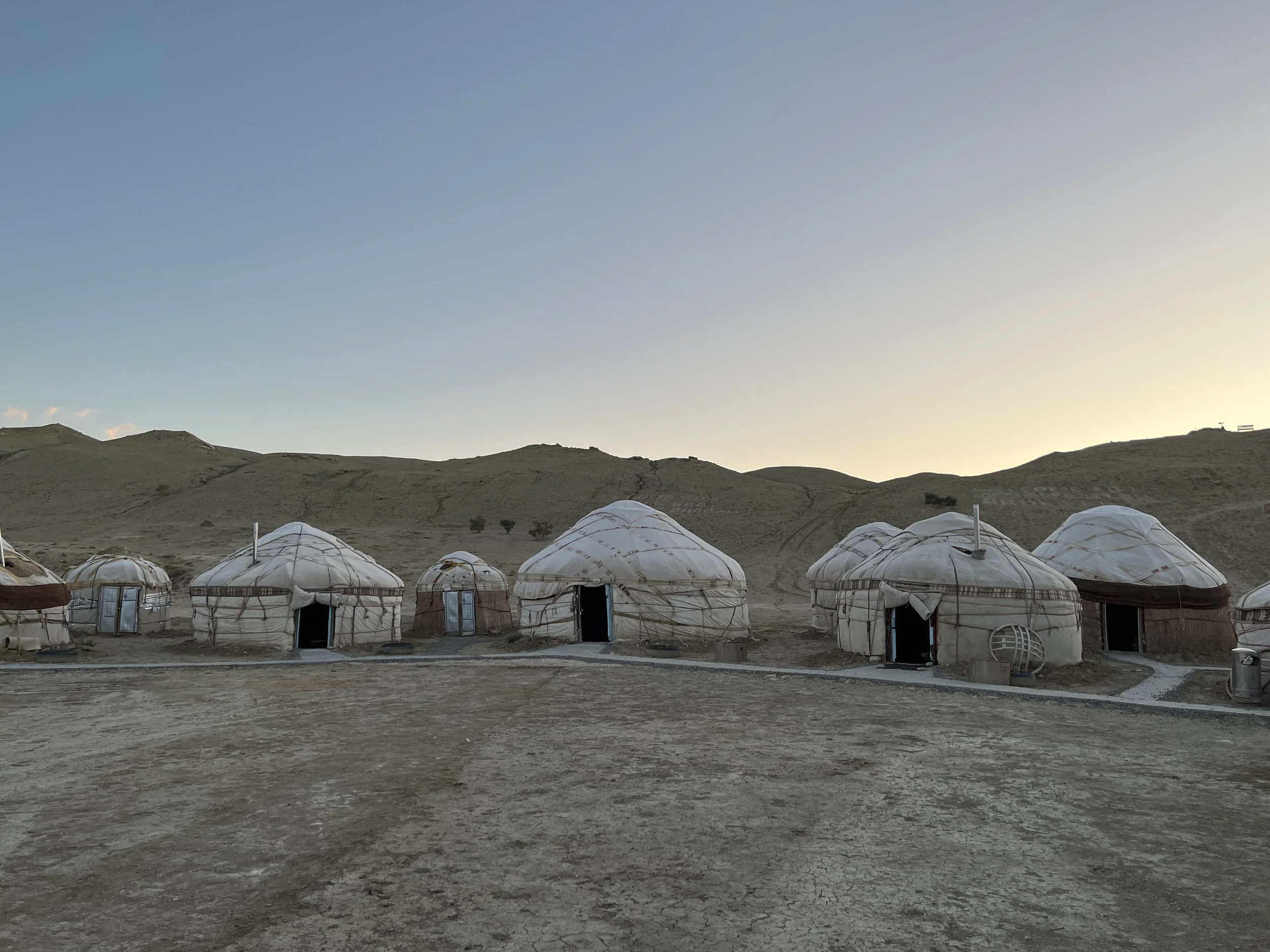 A group of traditional qaraqalpaq yurts set up on dry, cracked Aral Desert in a remote, hilly landscape at sunset or dawn. Photo by Dinara Mirtalipova for The Vanishing Sea Book research trip to the Aral Sea