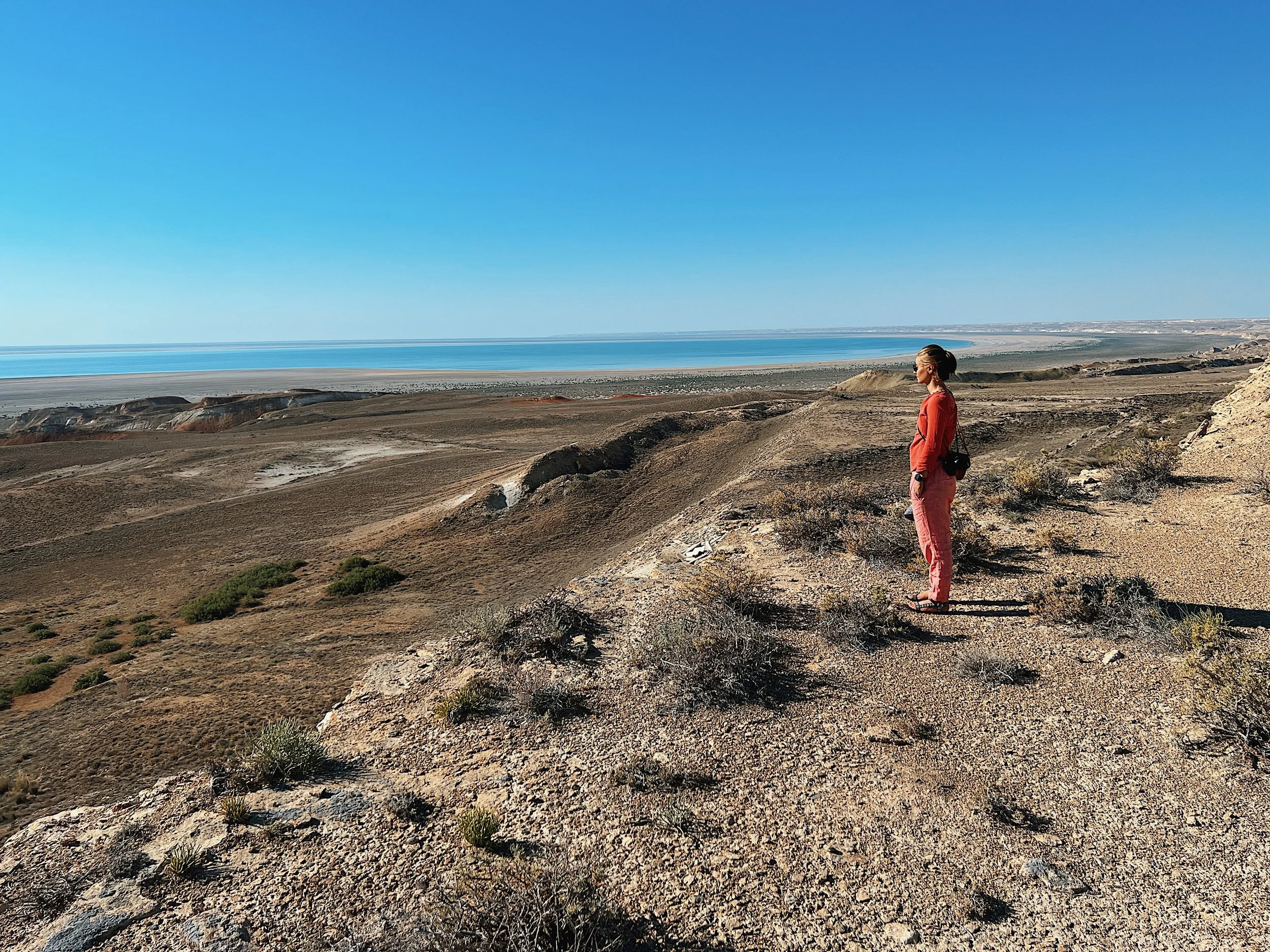 Dinara Mirtalipova mirdinara in a red jacket and pink pants standing on a sandy hillside of The Aral Desert overlooking The Aral desert coastline and ocean on a clear day.