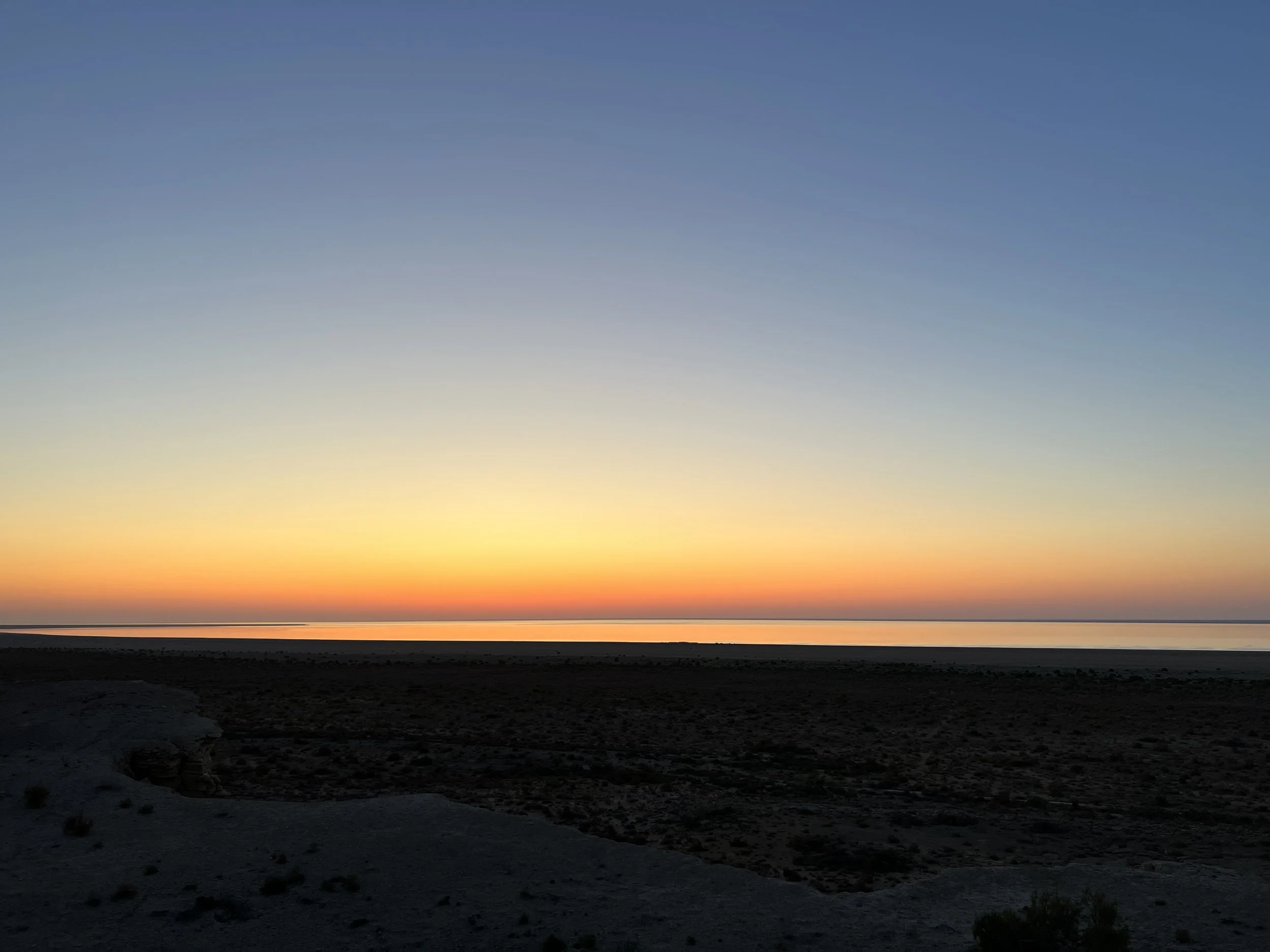 The Aral Desert landscape at sunset with the sky transitioning from blue to orange, and a calm body of water reflecting the colors in the background. Photo by Dinara Mirtalipova for The Vanishing Sea Book research trip to the Aral Sea