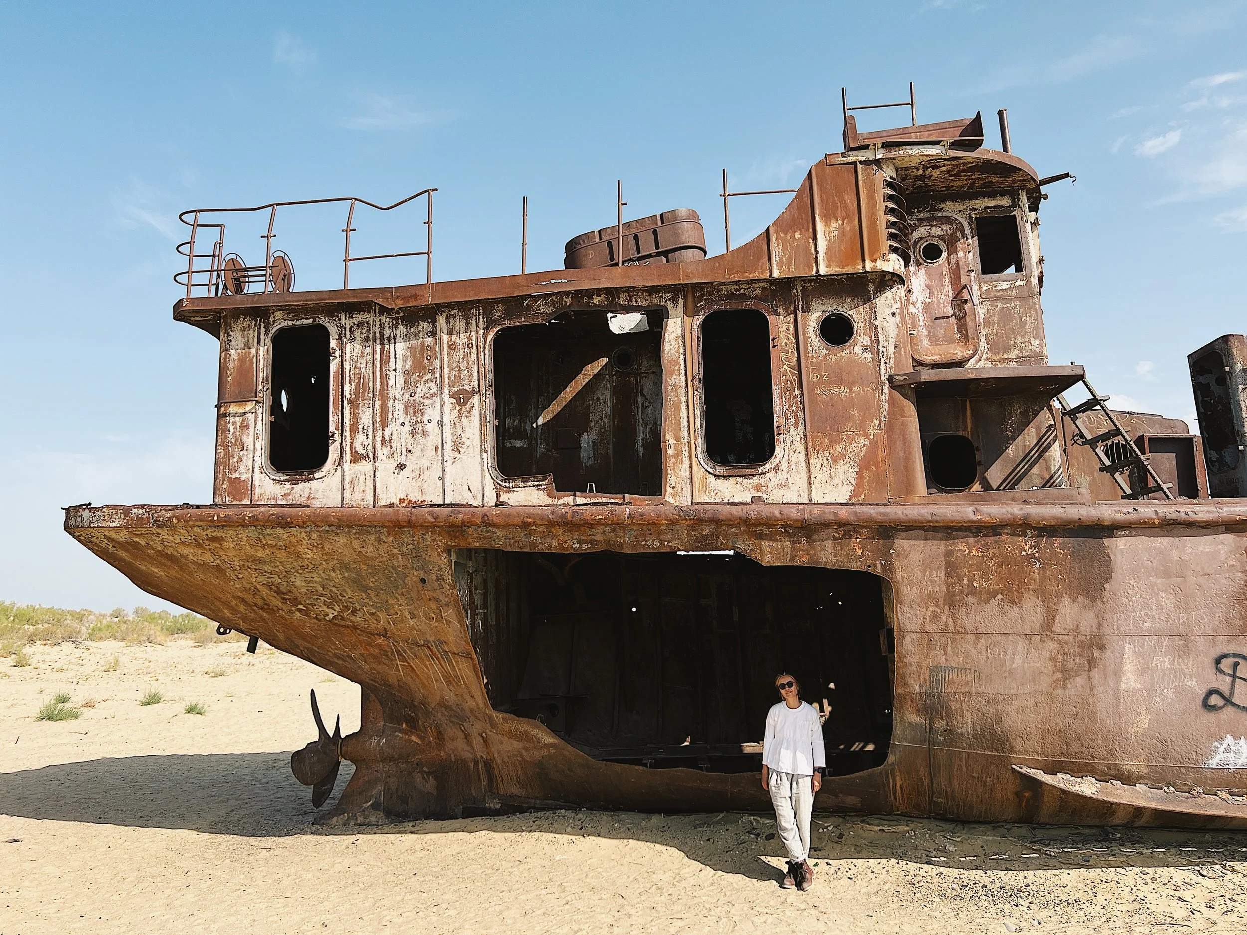 Dinara Mirtalipova standing next to a large, rusted, abandoned shipwreck on a sandy Aral desert landscape under a clear blue sky in Moynaq, the graveyard of ship.