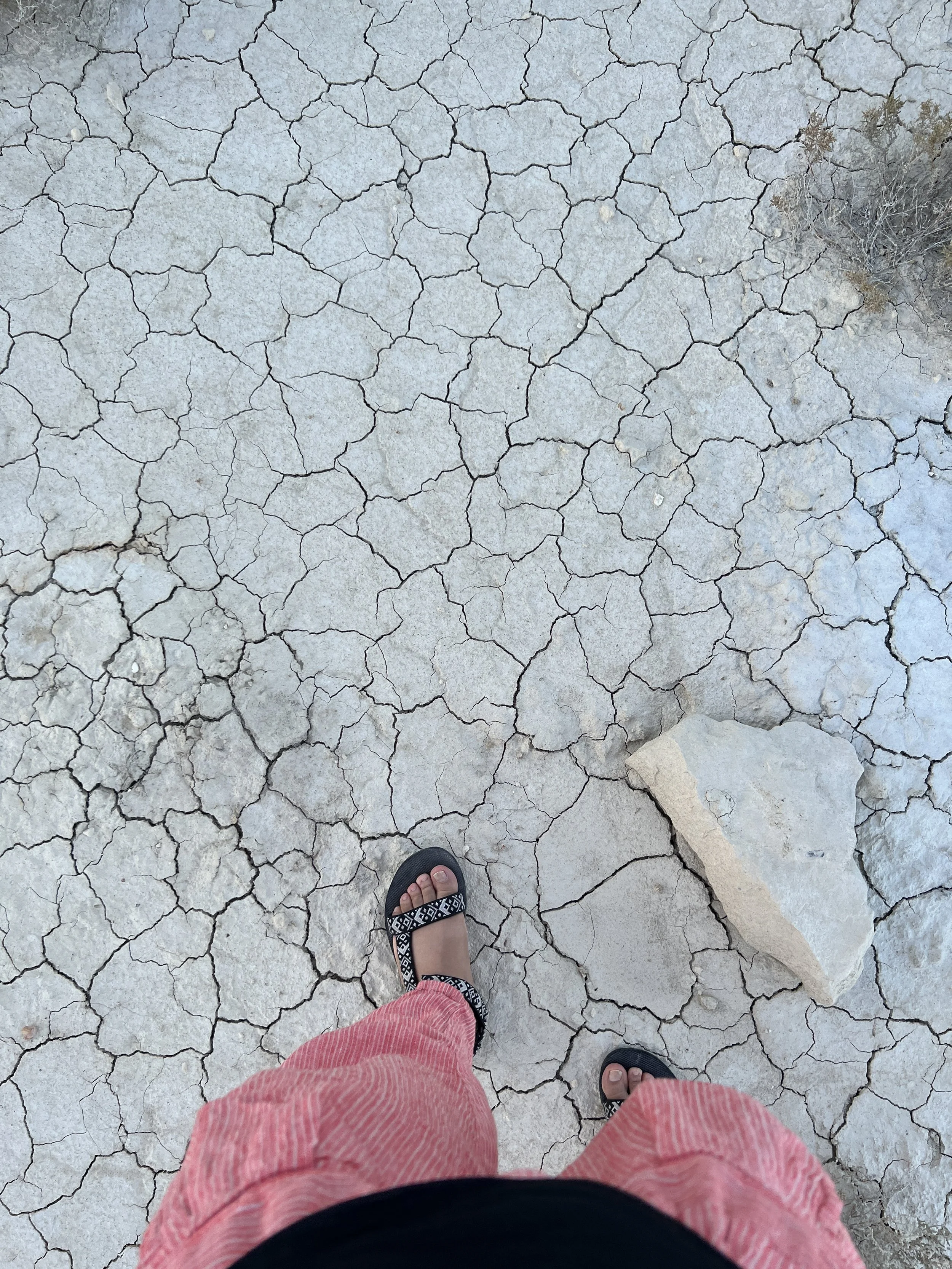Dinara Mirtalipova mirdinara standing on cracked dry ground wearing red pants and black sandals, with a small patch of dry grass and a large stone nearby. Photo by Dinara Mirtalipova for The Vanishing Sea Book research trip to the Aral Sea