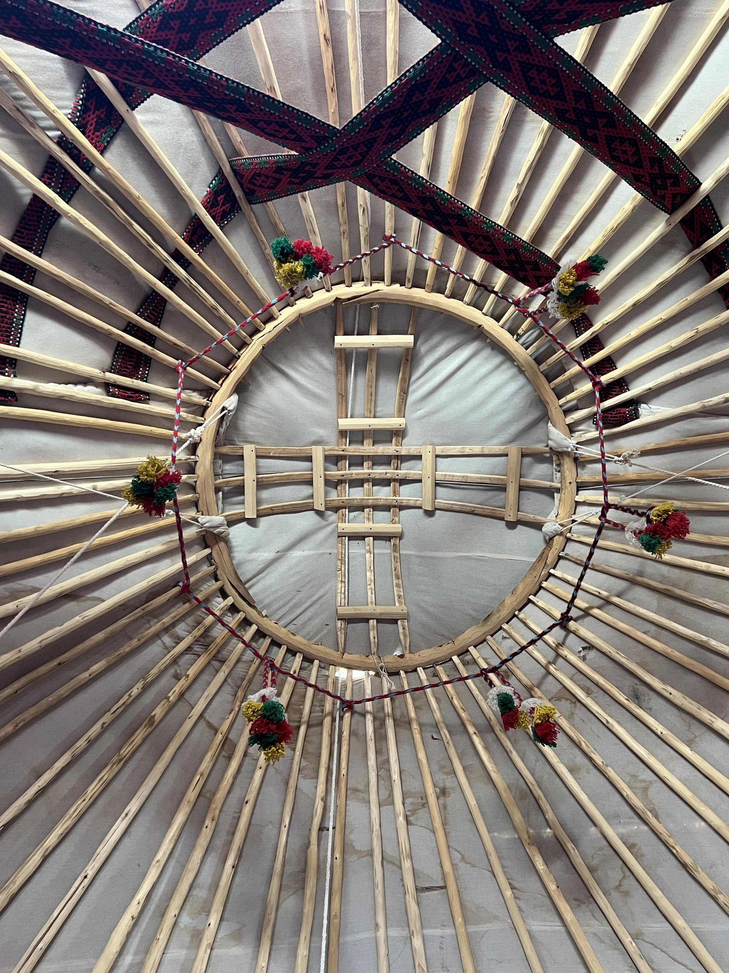 traditional qaraqalpaq yurt with wooden lattice framework, decorated with colorful woven straps and a string of small pom-poms in red, green, and yellow. Photo by Dinara Mirtalipova for The Vanishing Sea Book research trip to the Aral Sea
