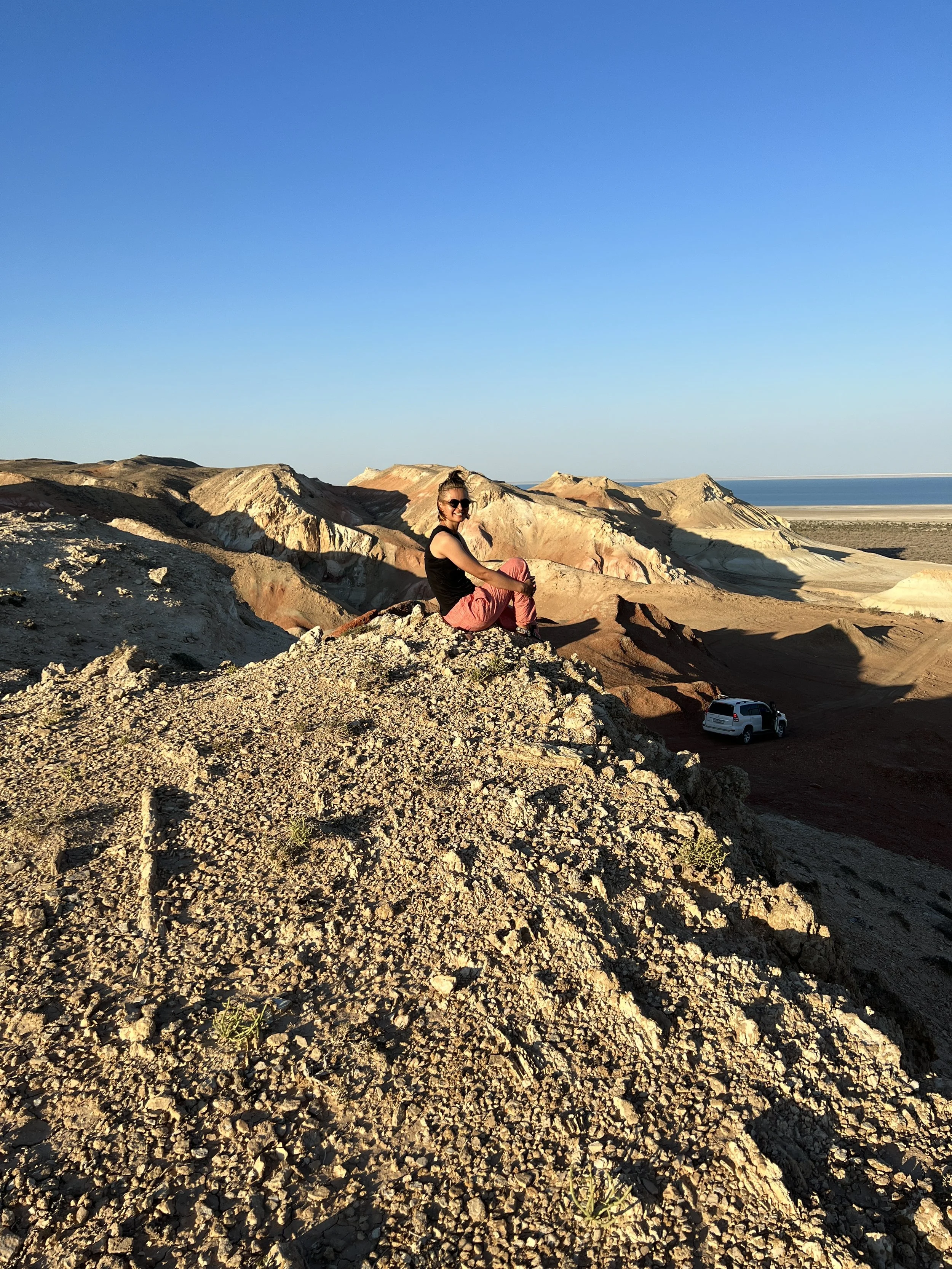 Dinara Mirtalipova mirdinara sitting on colorful rocky Aral desert landscape with distant mountains and a clear blue sky. Photo by Dinara Mirtalipova for The Vanishing Sea Book research trip to the Aral Sea