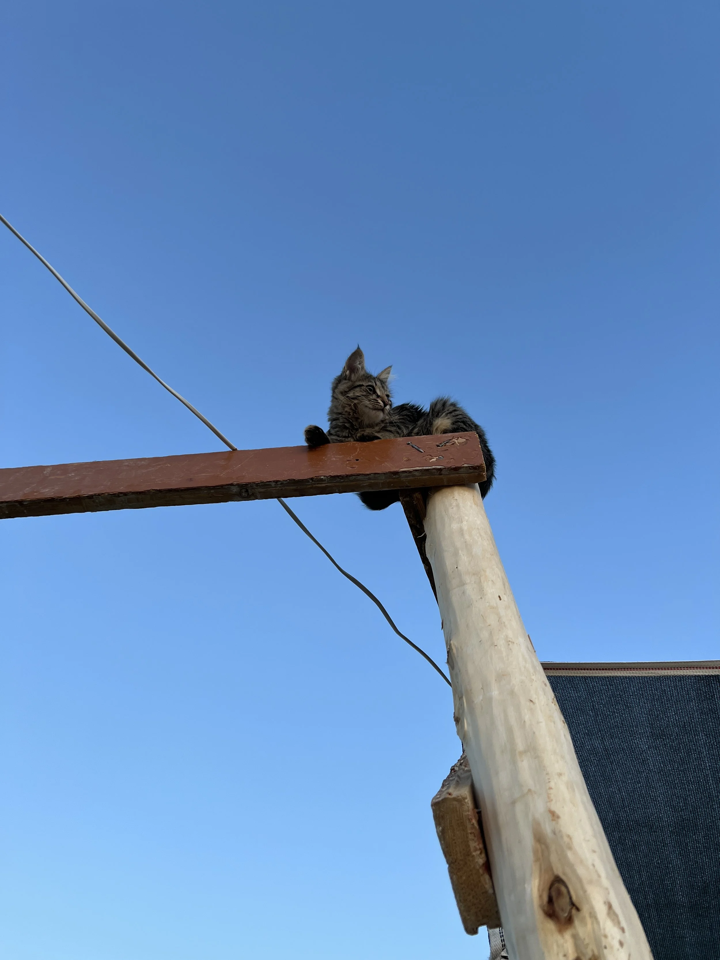 A cat with long fur lying on top of a wooden beam, high above the ground, against a clear blue sky. Photo by Dinara Mirtalipova for The Vanishing Sea Book research trip to the Aral Sea