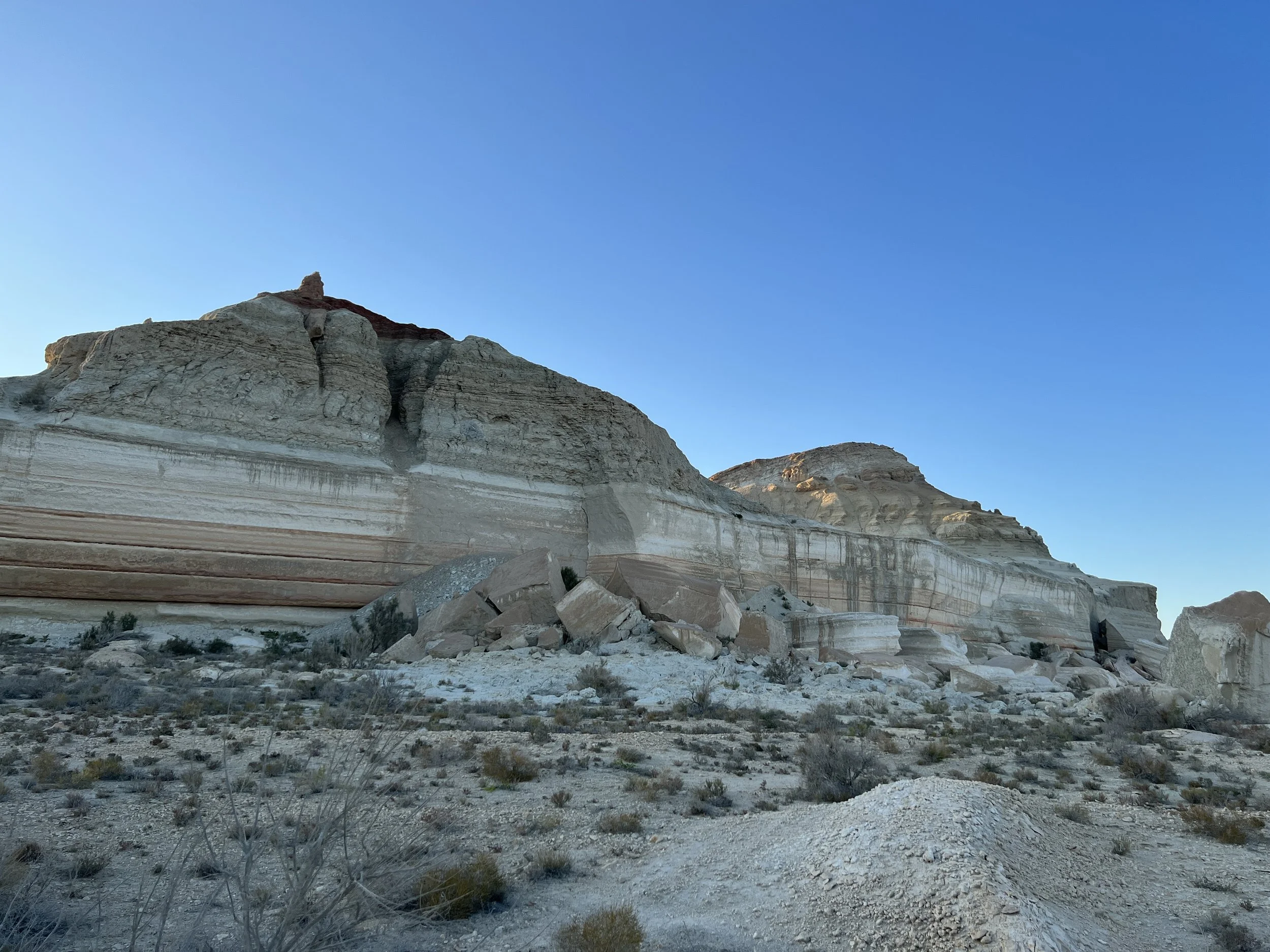 Aral desert landscape with layered white and beige rocky cliffs under a clear blue sky. Photo by Dinara Mirtalipova for The Vanishing Sea Book research trip to the Aral Sea