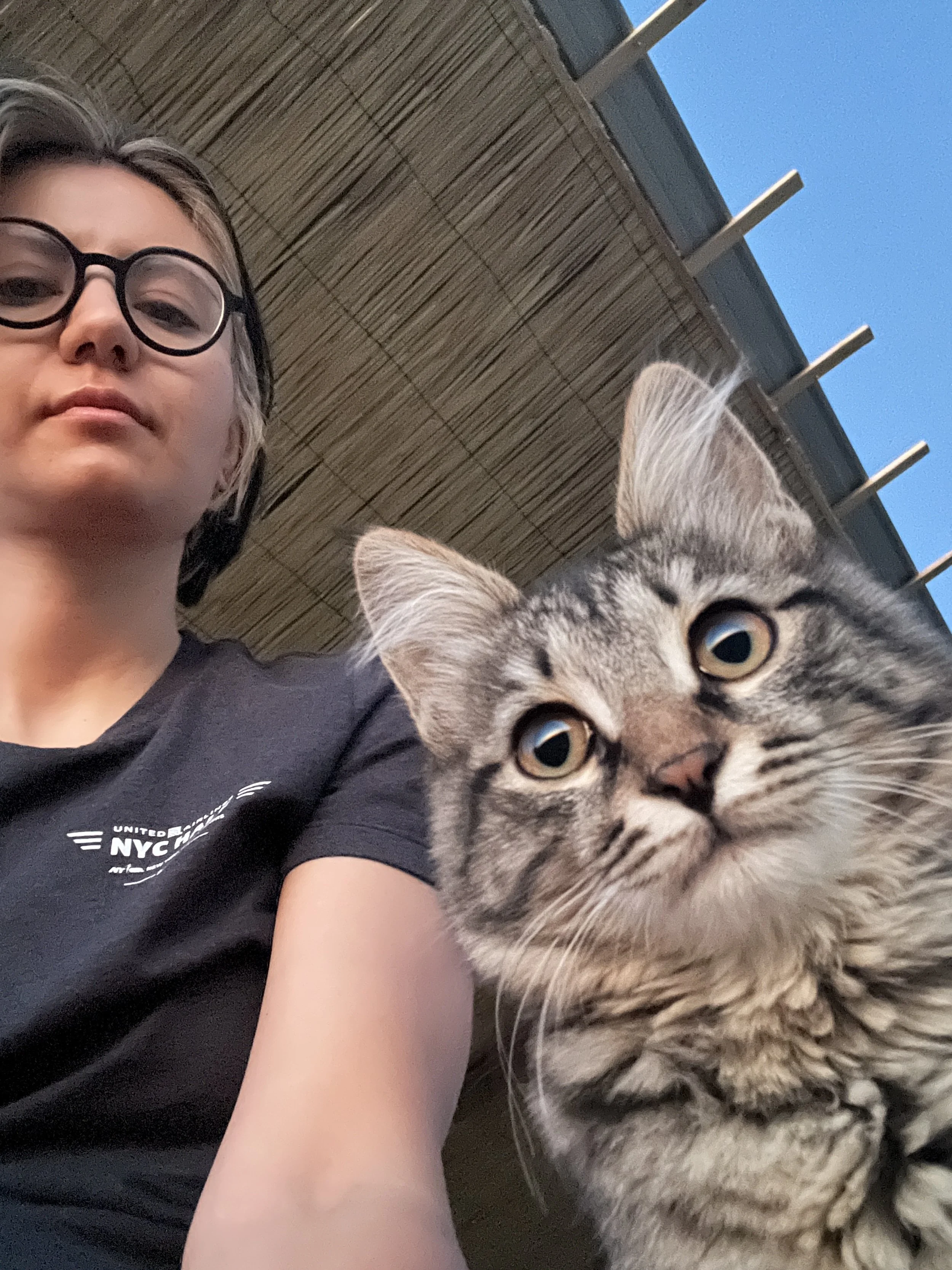 Dinara Mirtalipova mirdinara with glasses and a black t-shirt taking a selfie with her tabby cat at the sunrise near the Aral Sea. Photo by Dinara Mirtalipova for The Vanishing Sea Book research trip to the Aral Sea