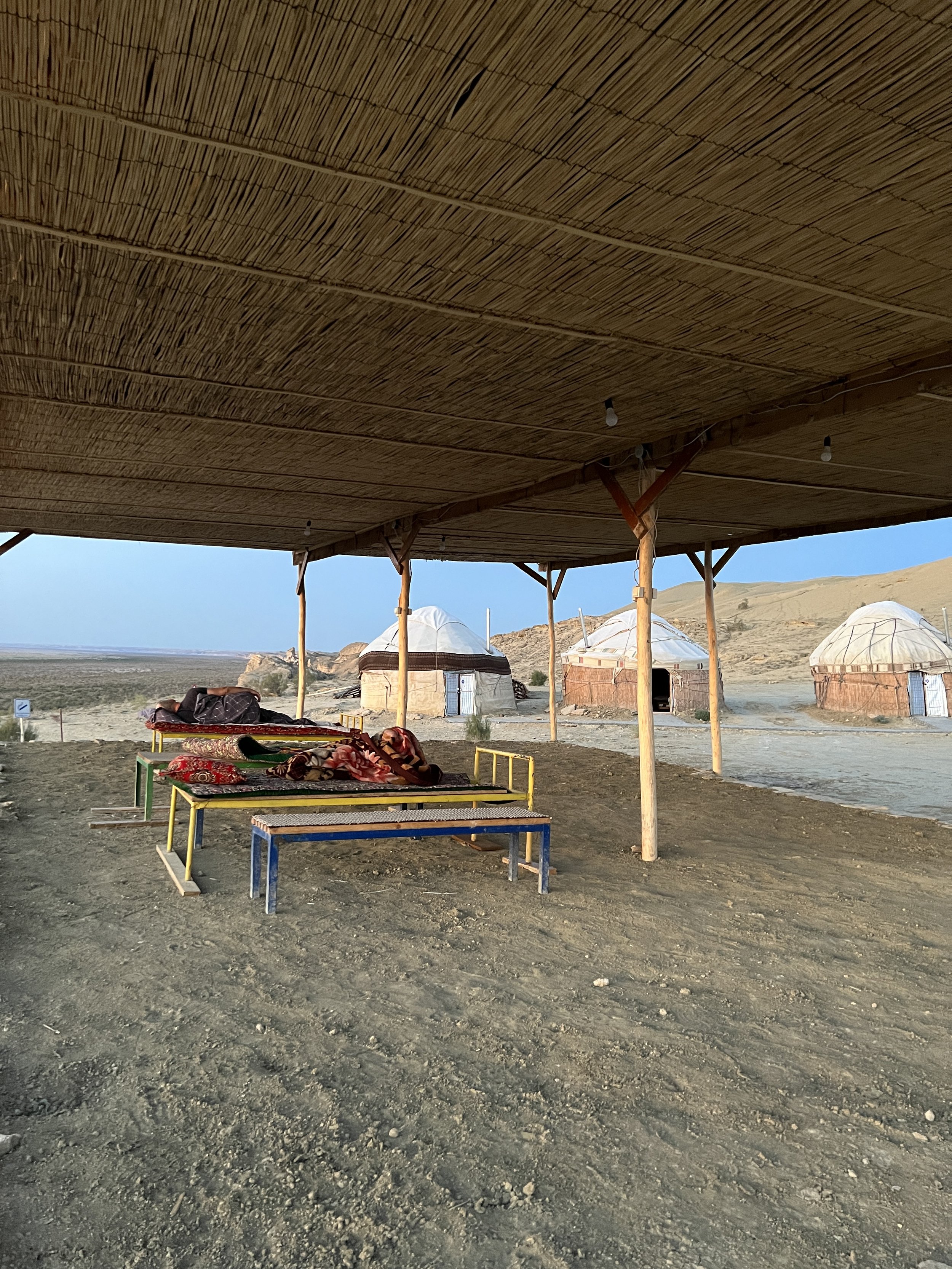 Outdoor seating area at dusk with wooden benches under a black canopy, dirt ground, qaraqalpaq yurts in the background, and a clear blue sky. Photo by Dinara Mirtalipova for The Vanishing Sea Book research trip to the Aral Sea