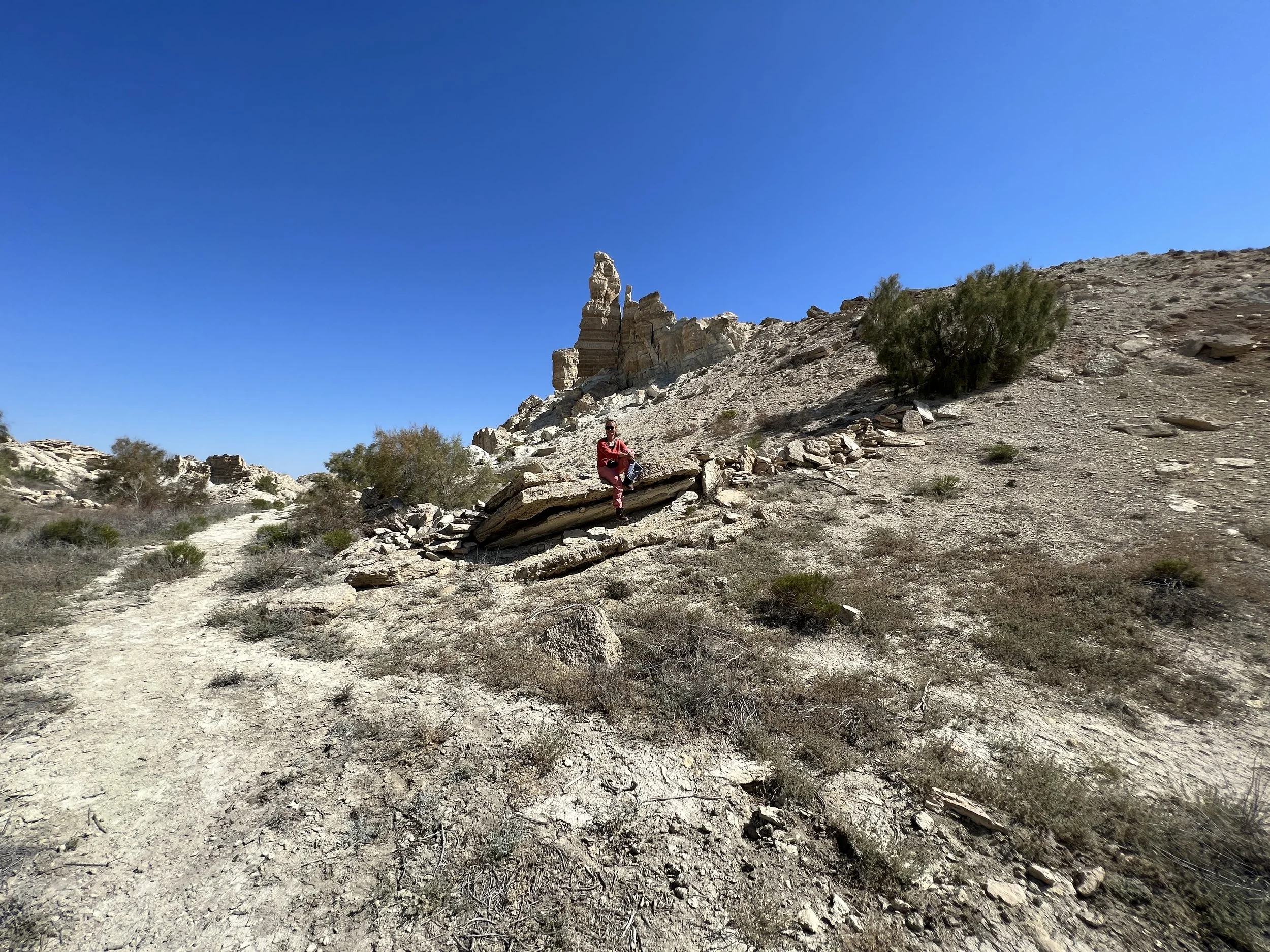 Dinara Mirtalipova sitting on a large rock in a Aral desert landscape with layered white and beige cliffs and sparse vegetation, under a clear blue sky. Photo by Dinara Mirtalipova for The Vanishing Sea Book research trip to the Aral Sea